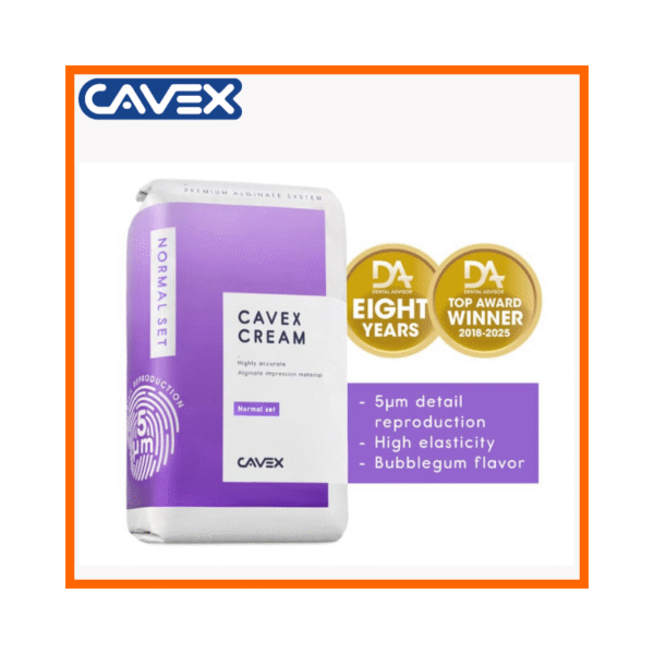 Combining 5 µm accuracy, high tear strength, and excellent elasticity, Cavex Cream ensures highly detailed, reliable impressions. Its creamy consistency, rapid water absorption, and user-friendly mixing properties make it a favorite among dental professionals.