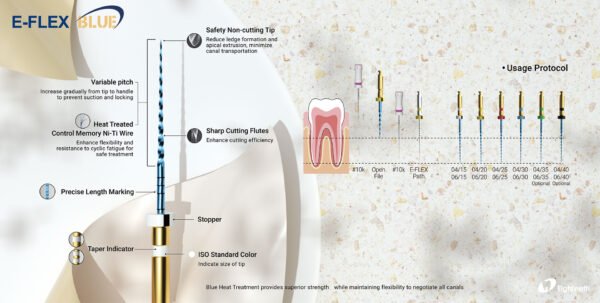 E-Flex Blue rotary files by Eighteeth, distributed in Ireland by Dentosupply, are premium heat-treated NiTi instruments designed for safe, efficient, and high flexible root-canal shaping.