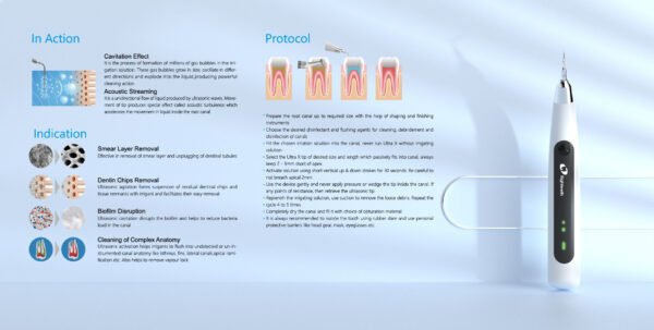 The Eighteeth Ultra X represents the next generation of endodontic ultrasonic activation. It operates at 45 kHz frequency to generate powerful cavitation and acoustic streaming, maximizing the penetration and cleaning efficiency of irrigating solutions inside the root canal system.